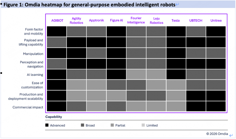 Omdia采用热力图模型对全球主流厂商进行了综合评估,涵盖产品形态、负载性能、灵巧操作、感知导航、AI学习、定制便捷、规模量产、规模商用共八项维度。智元在其中六项评估维度中获得最高评级(Advanced Capability),是本次评估中获得最多最高评级的厂商。